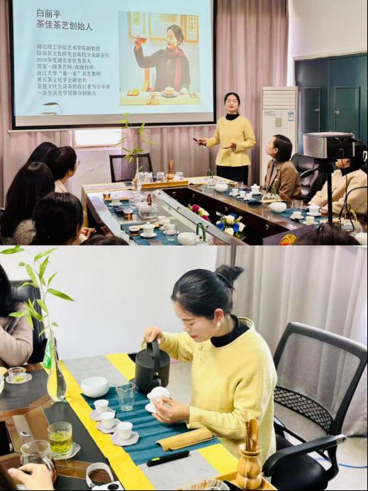 白丽平教授悉心为各位教师介绍茶文化中鞠躬礼、伸掌礼、叩指礼和寓意礼;六种按发酵程度和制作工艺的茶;喝茶时放置茶壶时壶嘴不能正对他人、斟茶时只斟七分等;又谈到茶与健康的关系,科普了“茶”一字最早写作“荼”的原因;又演示泡茶的层层步骤,温杯、投茶、候汤、冲茶、刮沫、淋壶…