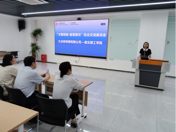 在大冶特钢会议中心,杨菁书记向企业介绍了公司近年来的发展情况和取得的成绩,她希望能与企业建立合作伙伴关系,就建立校外实习实训基地、聘请行业导师、举办专场招聘会、联合制定人才培养方案等进行合作。