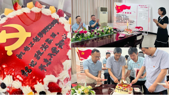 “不忘入党初心”的红色主题蛋糕映照着初心的力量,点亮的蜡烛如同党徽一般闪闪发光。