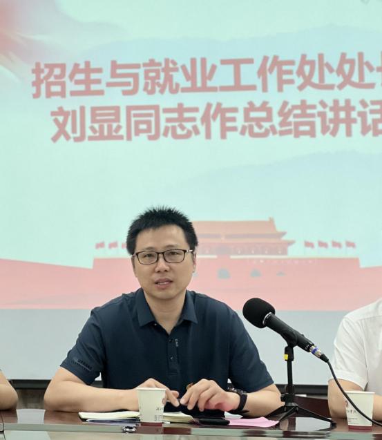 招生与就业工作处处长刘显首先肯定了机电毕业生党员们积极就业做出的表率和先锋模范带头作用。他表示,学校将确保高校毕业生就业大局稳定作为稳就业工作的重中之重,在毕业季聚焦关键环节,将多措并举促进全校毕业生更加充分更高质量就业。他就个人及就业工作经历进行分享,并解读了就业政策、以节约时间成本的角度,提醒毕业生和在校生们抓住就业黄金期,先就业后择业,积极投入社会,提升自身能力,适应社会发展,并预祝机电毕业生们都能高质量就业。