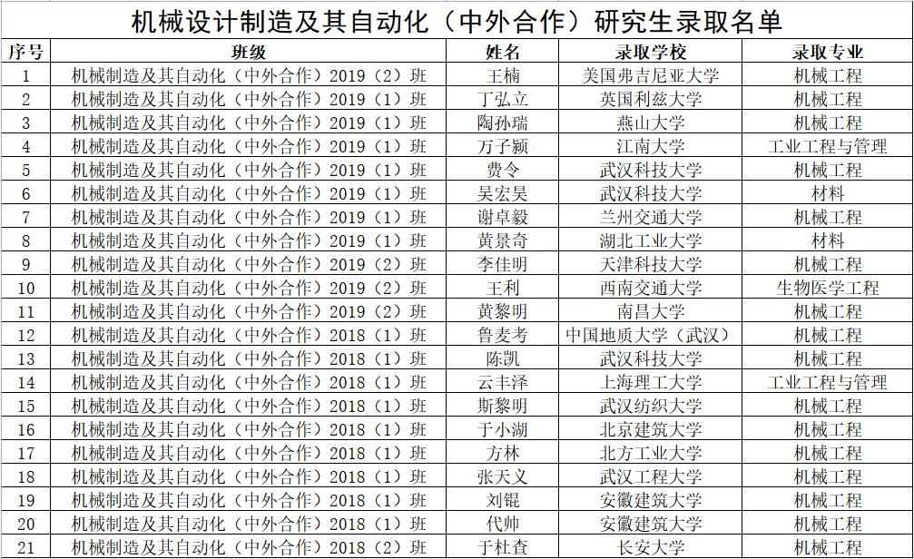 2)考研升学情况。毕业生考研率在20%左右,居于全校各专业考研率排名前列,其中,一大批毕业生被中国农业大学、武汉理工大学、长安大学、燕山大学等国内重点大学录取。