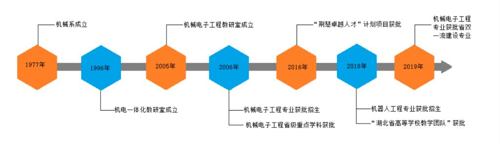 机械电子工程系的发展历程,可以追溯到上世纪70年代,其前身为机电一体化教研室。1977年国家恢复高考,当时学校就成立了机械系,并开始招收机械专业员工。1996成立机电一体化教研室,同时开始机制、机电等专科专业招生。2005年机电一体化教研室变更为机械电子工程教研室。2006年教研室所属专业机械电子工程获批本科招生资格。同年,“机械工程”学科被批准为省级重点学科。2015年获批“机械工程湖北省重点(特色)学科”。2016年获批湖北省“荆楚卓越人才”协同育人计划项目,2018年获批“湖北省高等学校教学团队”。2019年机械电子工程专业获批湖北省“双一流”建设专业。2021年机械电子工程教研室更名为机械电子工程系。2023年机械电子工程专业获评伟德国际1949官网4星专业。